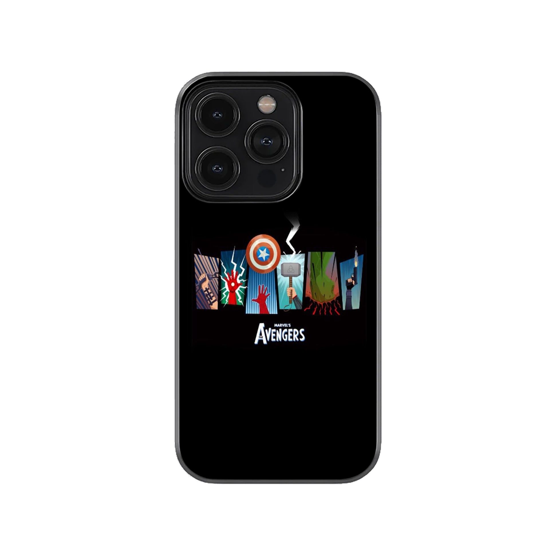 The “Avengers Unite Phone Case” is a protective accessory designed for fans of the Marvel Cinematic Universe. The case is a sleek, black color that serves as a perfect backdrop for the vibrant, stylized artwork. The design is broken into six vertical panels, each dedicated to a different hero: a web-like pattern for Spider-Man, a green-and-purple explosion for the Hulk, Captain America’s shield, Thor’s hammer Mjolnir, a hand with an arc reactor for Iron Man, and a flowing red cape for Doctor Strange. The combination of these symbols creates a powerful and cohesive visual that celebrates the core members of the Avengers team. It’s a stylish way to showcase your fandom while keeping your phone safe from daily wear and tear.