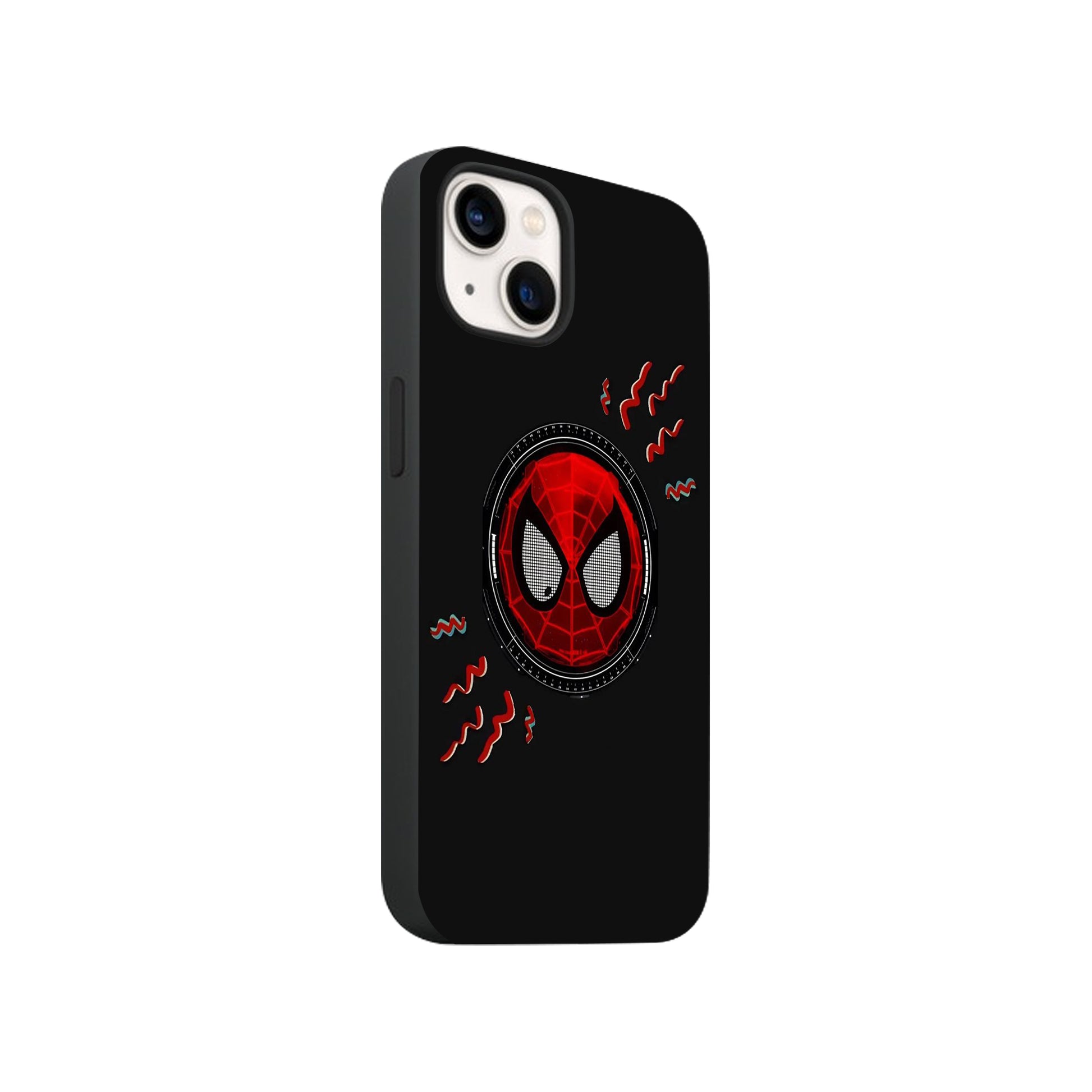 This is a phone case featuring a minimalist yet striking design of Spider-Man’s mask. The design centers on the iconic red mask with its distinctive black web pattern and large, reflective white eyes. The eyes appear to have a subtle digital or futuristic flair, suggesting the suit’s technological upgrades. Around the central image, subtle red “web” or “sense” lines trail off, adding to the dynamic feel. The case itself is black, providing a strong contrast that makes the red and white elements pop.